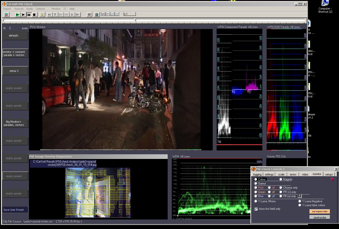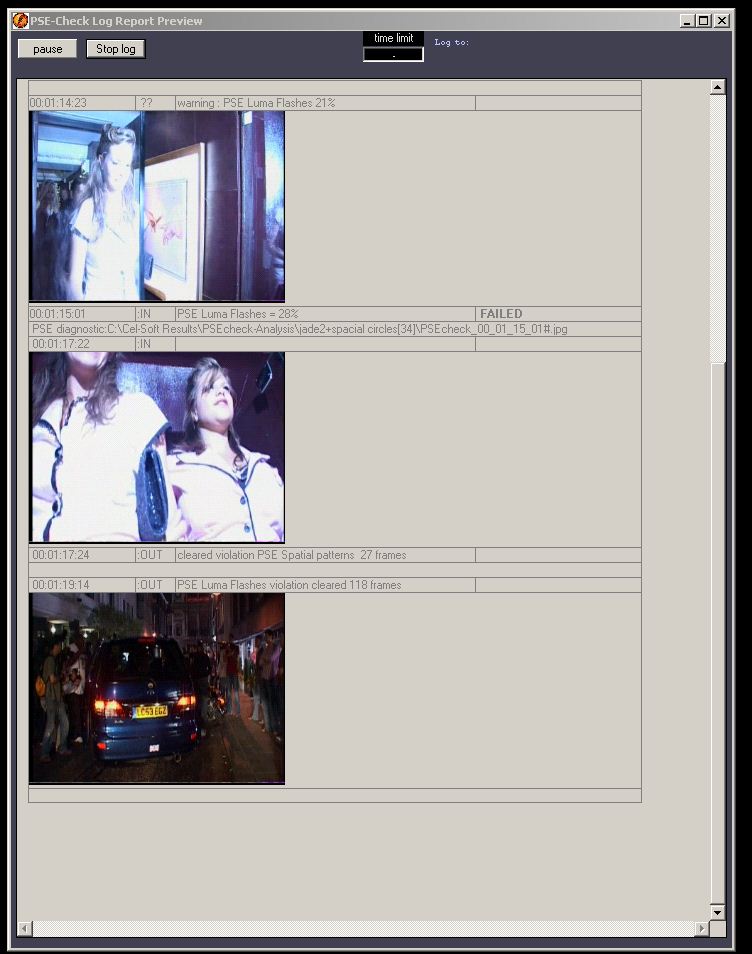 PSE-Check is a program that runs on a performance Windows PC without special hardware. The basic version is intended for individual desktop use. It performs a complete set of PSE quality control tests on video media content. Any excursions outside the user set test parameters are logged with associated timecodes and detail notes together with a thumbnail images in easy to read, RTF-formatted reports.